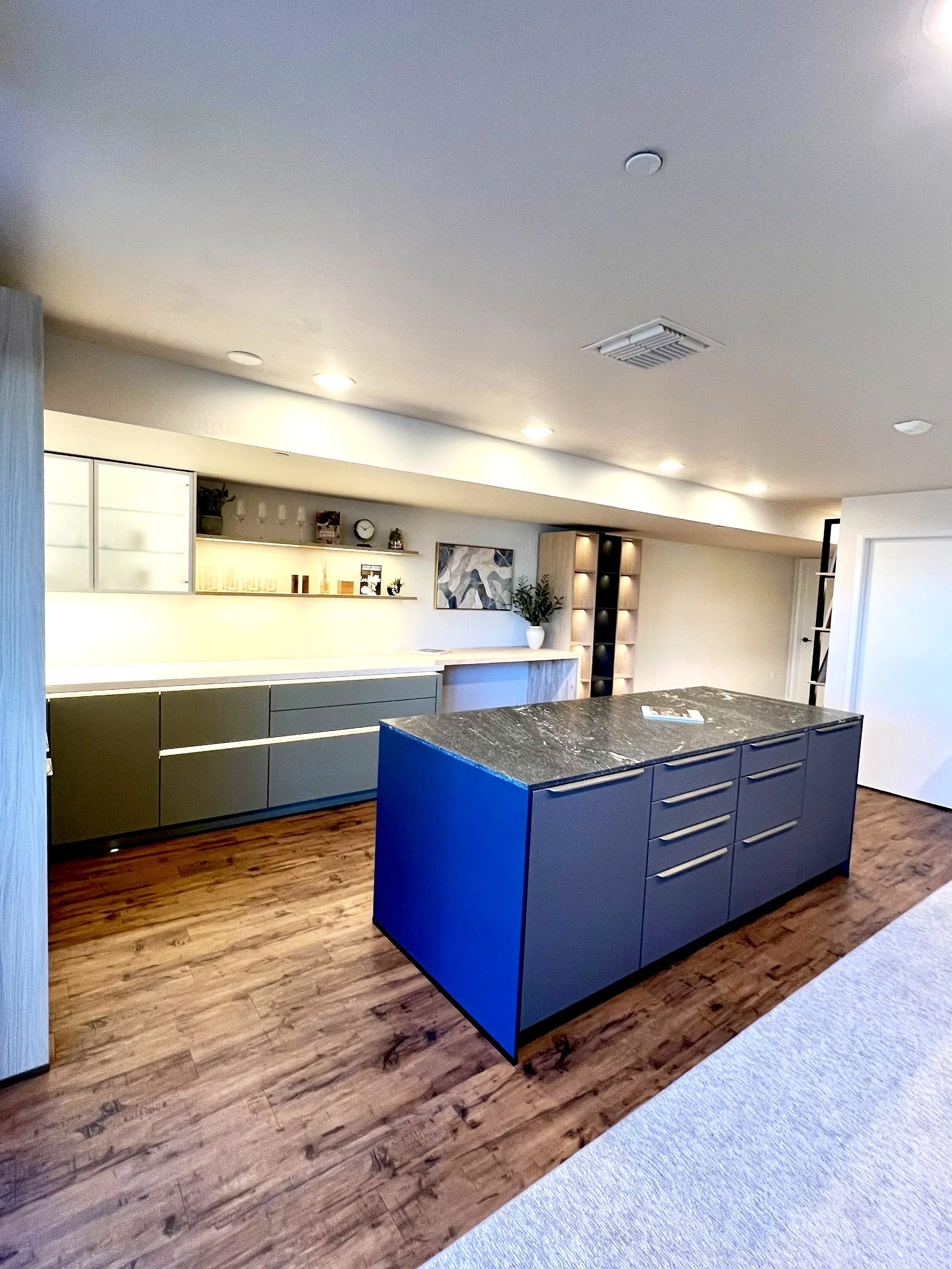 Rich wood flooring, layered lighting, and curated shelving complete the transformation, offering clients a welcoming setting where they can explore finishes, storage solutions, and layout possibilities. This space offers clients a clear vision of how Nobilia kitchens can bring both beauty and functionality into their own homes. The result is a studio that reflects the strength of Nobilia’s design paired with the dependable workmanship of Redwood Builders.